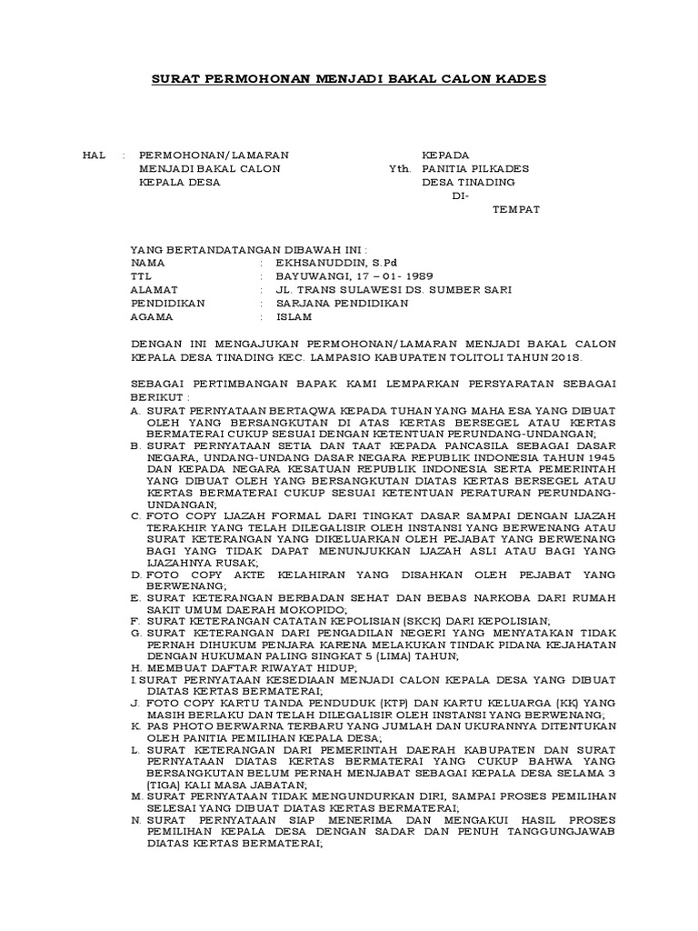 Contoh Surat Lamaran Calon Kepala Desa - Barisan Contoh from image.slidesharecdn.com Diatur dalam peraturan menteri dalam negeri nomor 83 tahun 2015 tentang pengangkatan dan. 5 daftar contoh surat ketarangan usaha dari desa. Panduan cara membuat surat lamaran seperti lamaran umum, fresh graduate, via email, tulis tangan, sebagai guru, cpns, di hotel, di bank, di toko, rumah sakit, berdasarkan iklan, bahasa inggris, +doc. Anda bisa membuat surat lamaran kerja seperti pada contoh berikut ini. Surat lamaran kerja merupakan salah satu syarat untuk mendapatkan pekerjaan yang ingin anda dapatkan. Malang, 16 agustus 1995 agama : Surat lamaran kerja adalah sebuah surat yang dibuat untuk keperluan permohonan kerja di sebuah perusahaan, kantor, atau instansi. Semoga bermanfaat buat sobat desa yang membutuhkan apabila ingin melamar/memohon/mendaftar dalam proses pendaftaran pencalonan kepala desa (kades).